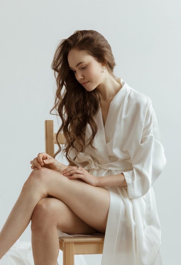 Eva to bardzo elegancki, kobiecy szlafrok wykonany z jedwabiu naturalnego o satynowym wykończeniu. Jedwab, z którego uszyty został szlafrok jest niezwykle lekki, przyjemny w dotyku, lejący a zarazem mięsisty i nieprzezierny. Jego ponadczasowa i uniwersalna forma świetnie sprawdzi się zarówno podczas wyjątkowych okazji jak na przykład przygotowania przedślubne, a także na co dzień.